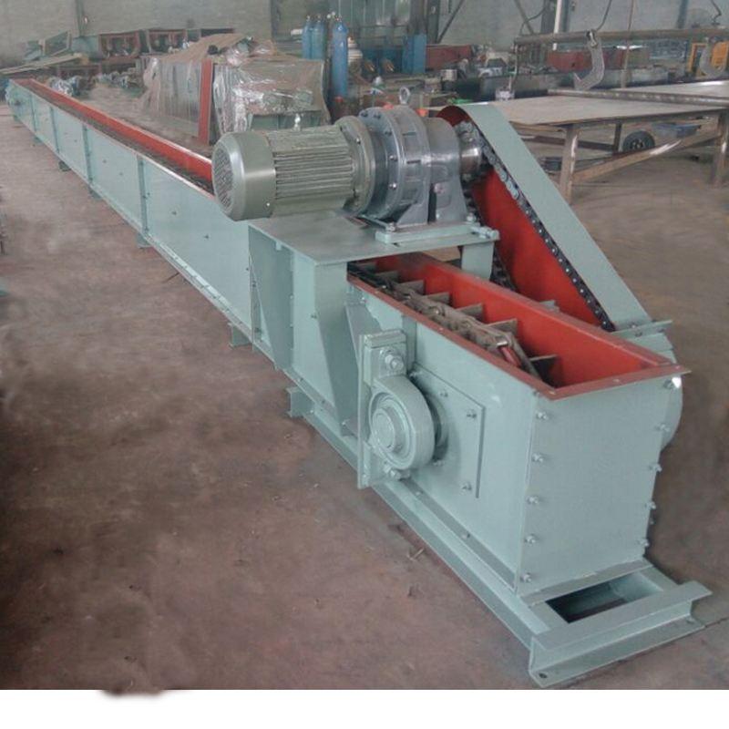 物料經設備進料口均勻的進入槽體底部,由從機尾向機頭方向作封閉連續運行的承載刮板輸送鏈講物料從進料口處連續均勻的輸送至出料口排除,可實現多點進料、多點卸料。